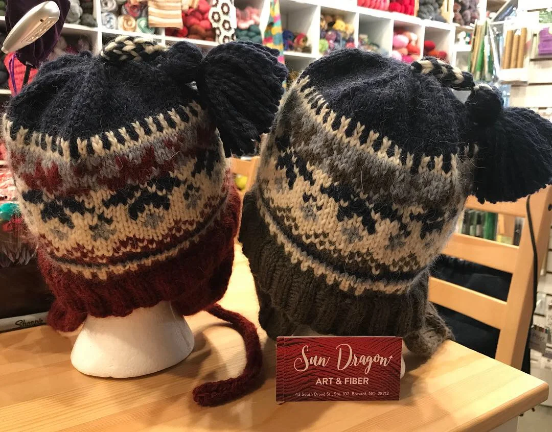 Hats are a quick and easy gift, and this hat is a great way to learn fair isle (stranding colors) or improve your fair isle skills! Kits are available for $40 in the colors pictured below, or for the colors of your choice from our shop for an additional $10 fee. The ear flaps and tassel are optional and attached once the main hat is done.