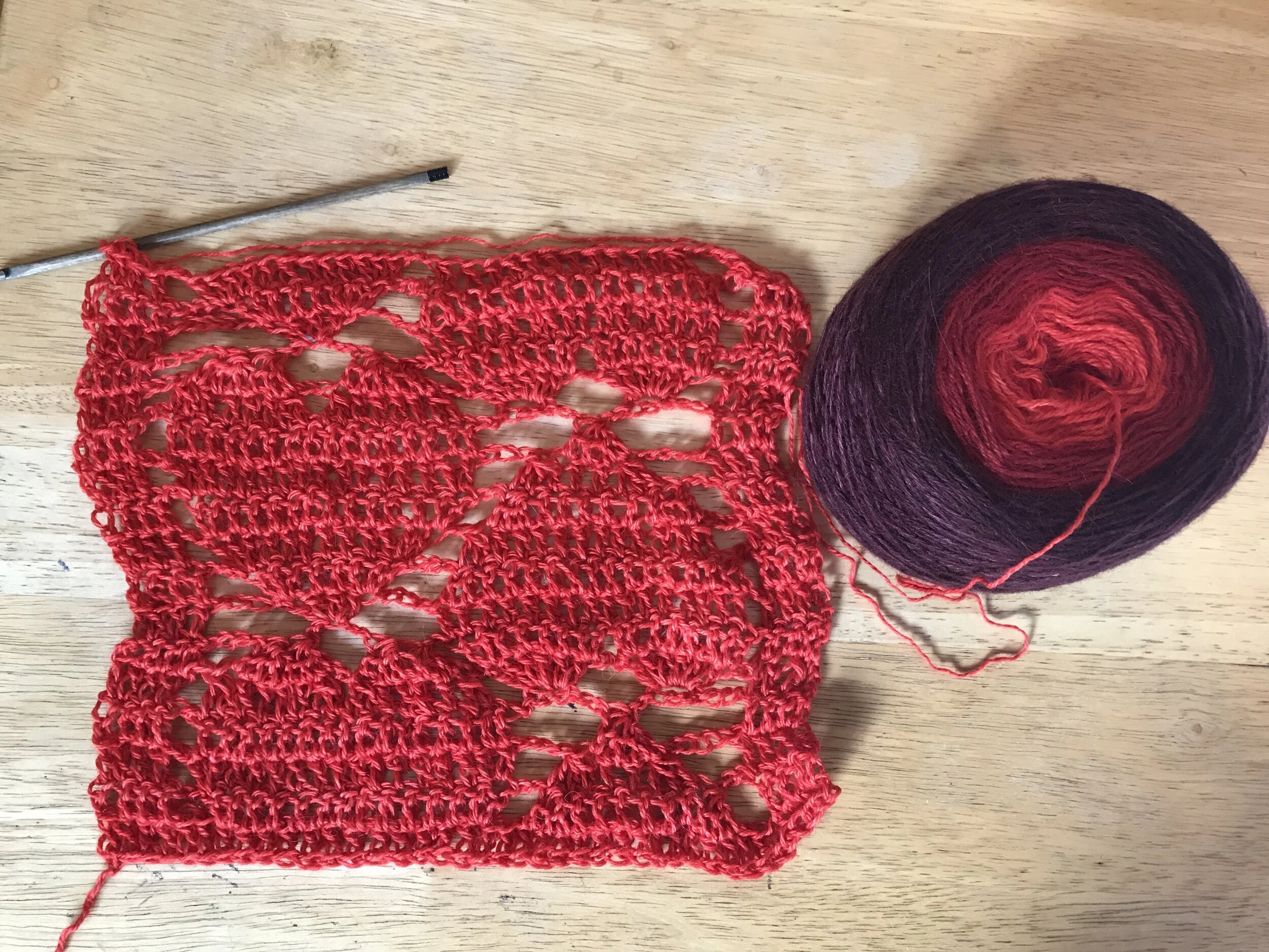 Falling Hearts pattern by Hand Made by Beth free on Ravelry. We can print this for you with a yarn purchase or a small printing fee in the shop. The picture below is the Ravelry listing pic, not a yarn we have in the shop.